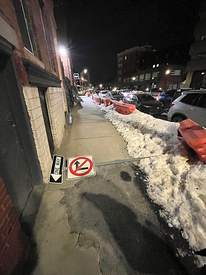 154 Stuart St, Boston, Ma, 02116Sign completely blocking walkway, inaccessible for handicap access. Wedged between building, snow bank, and construction barrier. Unable to move.