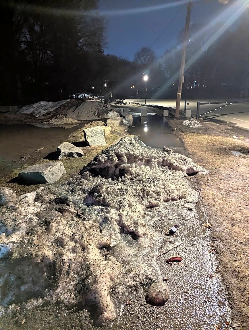 Intersection Of Glen Ln And Glen Rd And Jewish War Veterans Dr And Pierpont Rd, Jamaica Plain, MaSidewalk blocked at Franklin Park. Snow on one side, flooded on the other