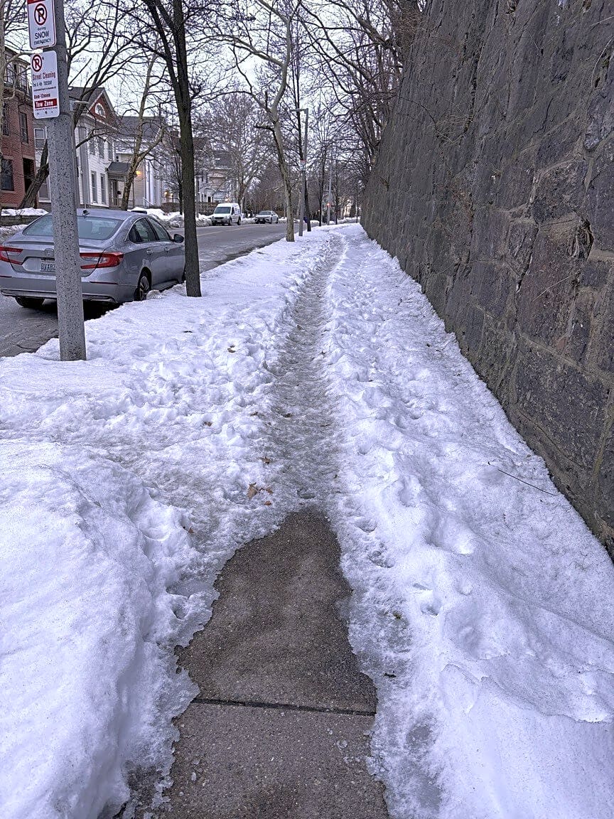 Intersection Of Merton Pl And Centre St, Roxbury, MaCity-owned sidewalk not shoveled yet. Has not been shoveled at all during any of the snow storms. My second or third report. What’s the situation here?