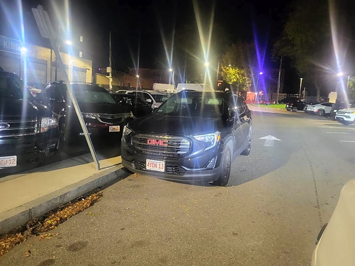 Vehicle illegally parked on island in the wrong direction in parking lot. Was been left here like this all week.