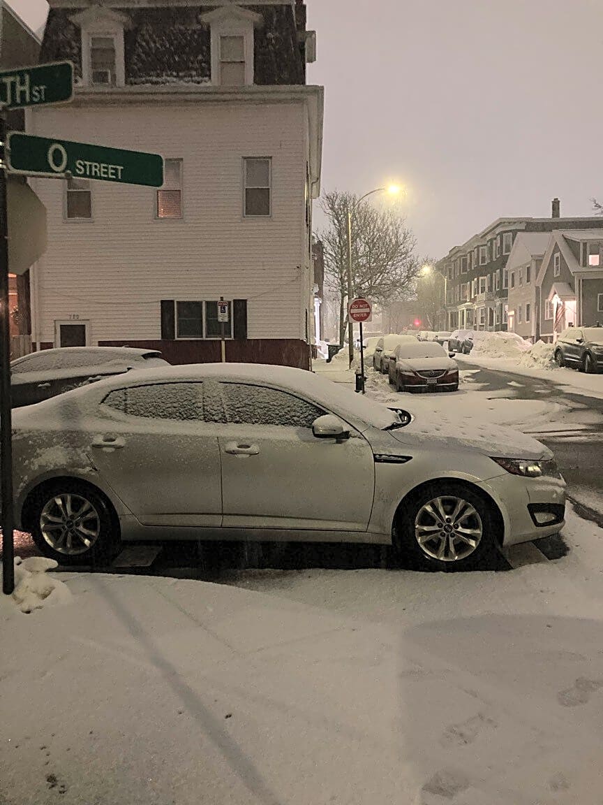 Intersection Of O St And E Sixth St, South Boston, MaAt 779 E 6th Street, South Boston, a silver Kia (license plate 4EBB37) is parked completely blocking the crosswalk and extending into O Street.