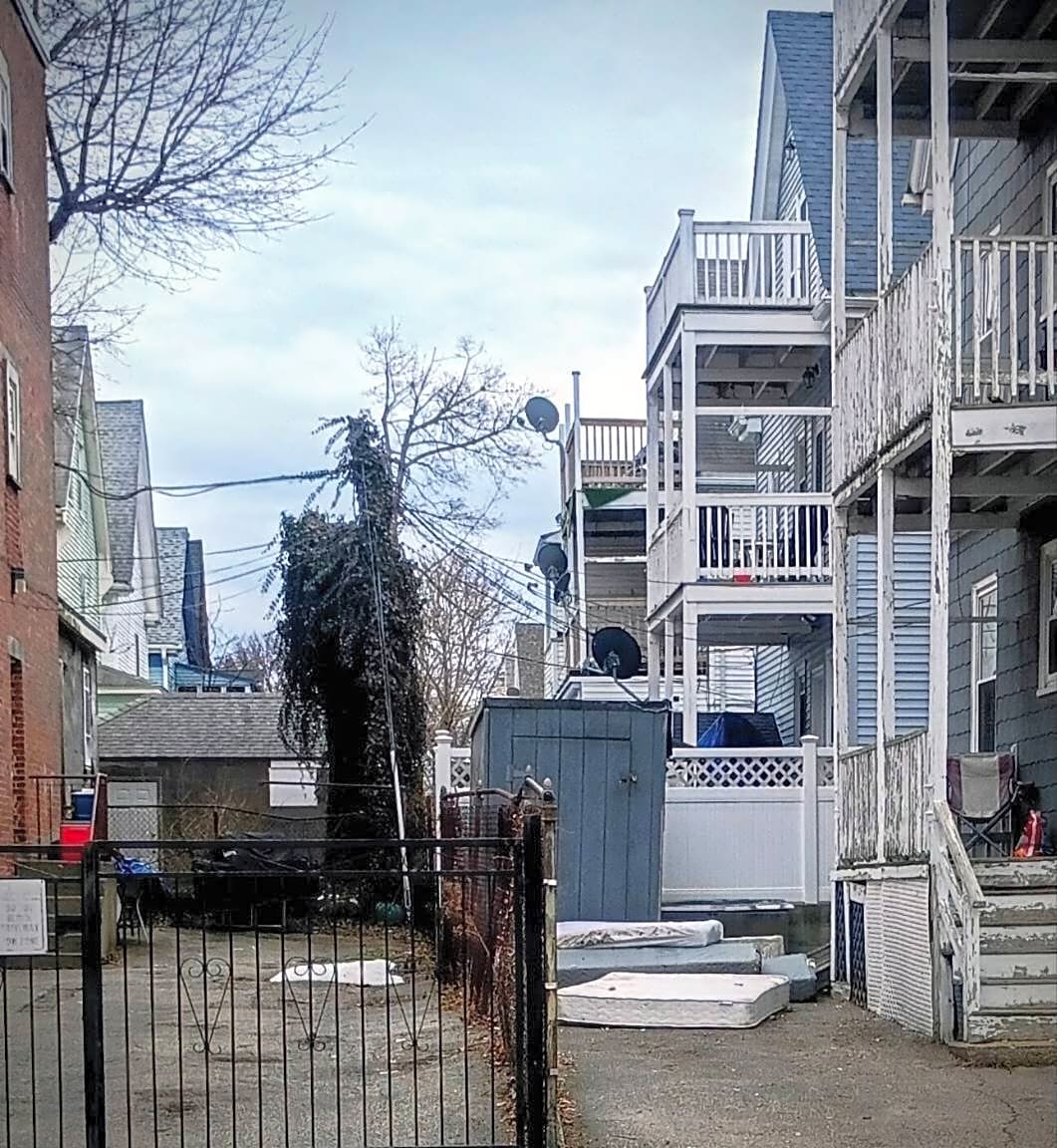 Homeless person dumped and scattered their belongings all along the sidewalk (in front of 20, 22, 30 and 32 David Mugar Way).