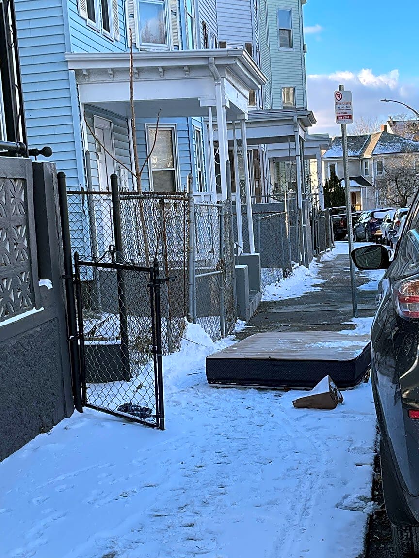 8 Elder St, Dorchester, Ma, 02125Mattress on sidewalk at address 8-10 elder st Boston. Please pickup, it’s been there for few weeks.