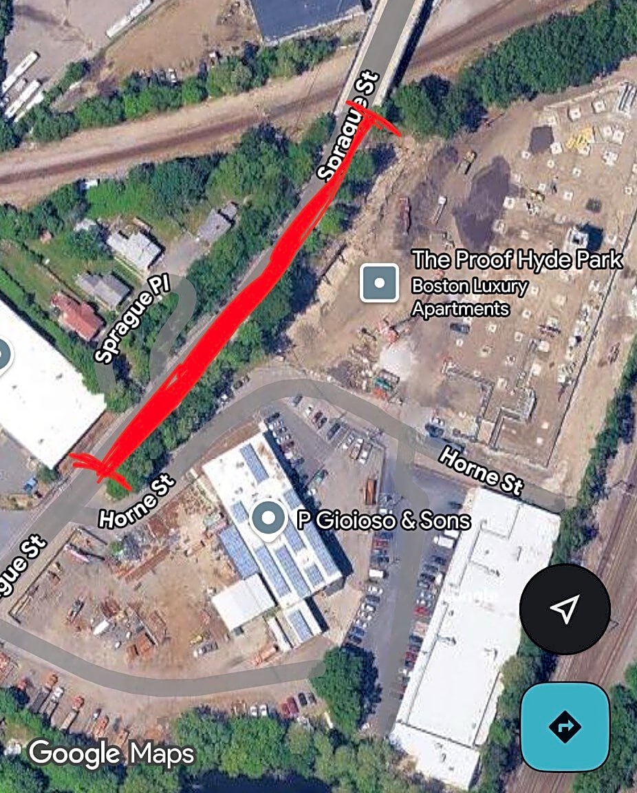 36 Sprague St, Hyde Park, Ma, 0213636-40 Sprague Street, Hyde Park (“the proof” luxury residential complex): sidewalk has not be cleared at all, 3+ feet of snow, no safe path on foot exists, pedestrians must walk in road for ~300 feet