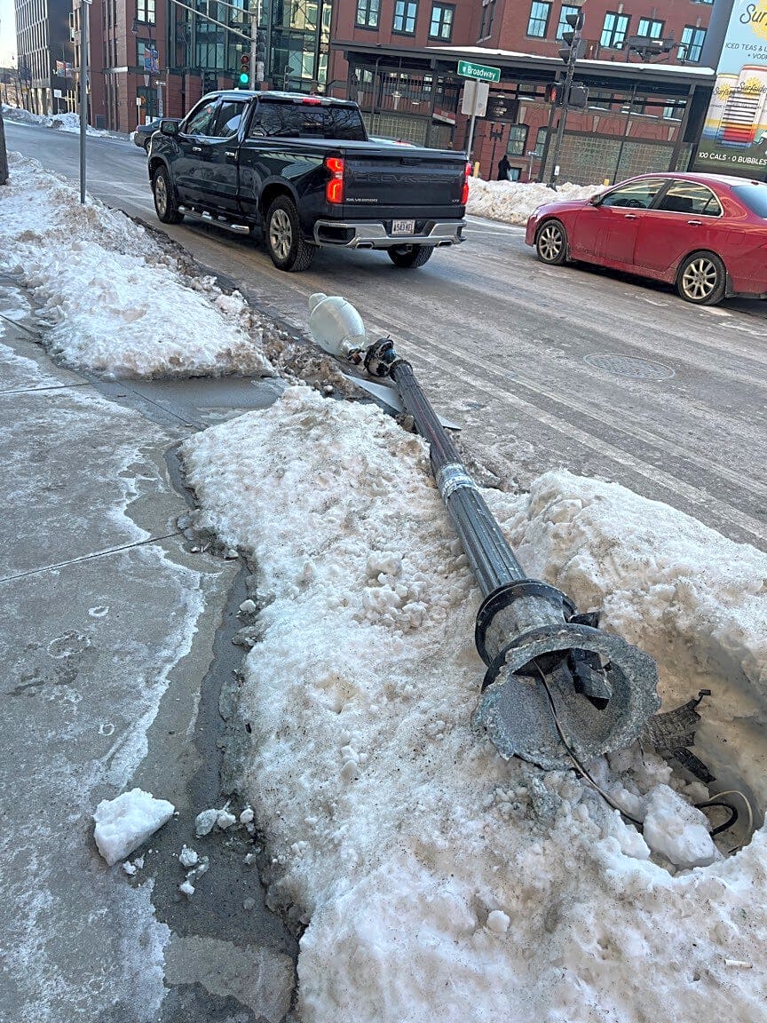 Broadway & Dorchester AveFallen Lamp post impeding traffic on Dorchester Ave directly in front of Cambria Hotel (6 W Broadway)