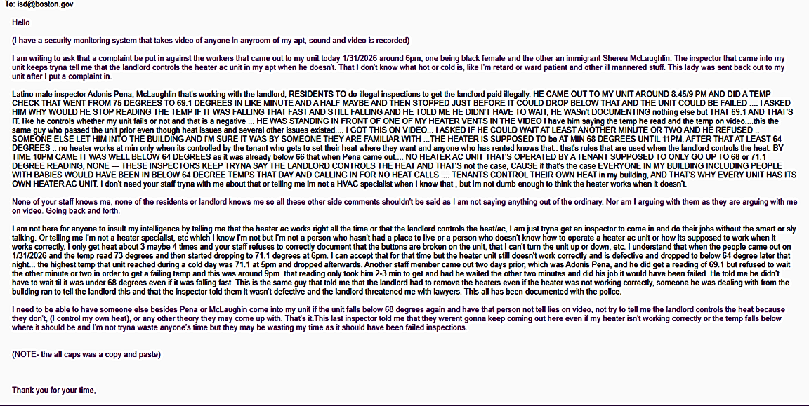 101 117 Atlantic Ave, Boston, Ma, 02109DEFCTIVE HEATER AC UNIT THATS CONTROLLED BY ME, THE TENANT, DEFECTIVE BATHROOM VENTALIATION SYSTEM THAT DOESNT TAKE ODOR OUTTA THE BATHROOM AT ALL, ODOR FILLS THE ENTIRE APT, FUSE BOX THAT SPARKS AND DOESNT ALLOW ME TO HOOK UP AT TV.
