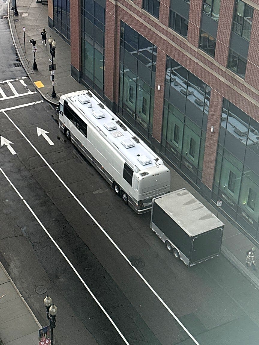 Intersection Of Anthony Rip Valenti Way And Beverly St, Boston, MaRV / Tour Bus has been parked illegally in this spot, idling or running a loud generator for nearly 24 hours in a residential area.
