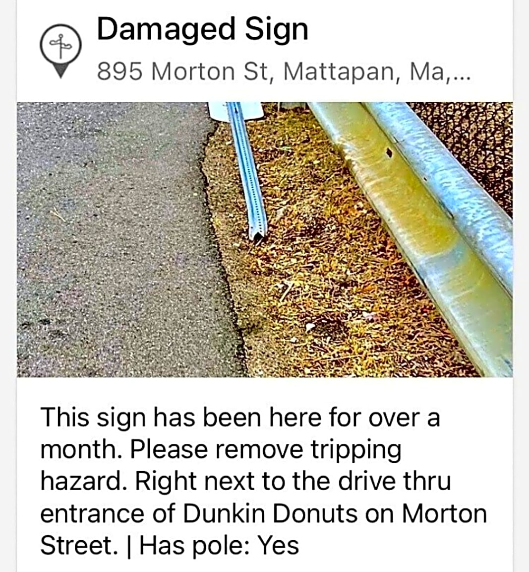 895 Morton St, Mattapan, Ma, 02126The street sign is still there. This was placed by the entrance of the Dunkin Donuts to avoid folks from tripping. When will this get removed?