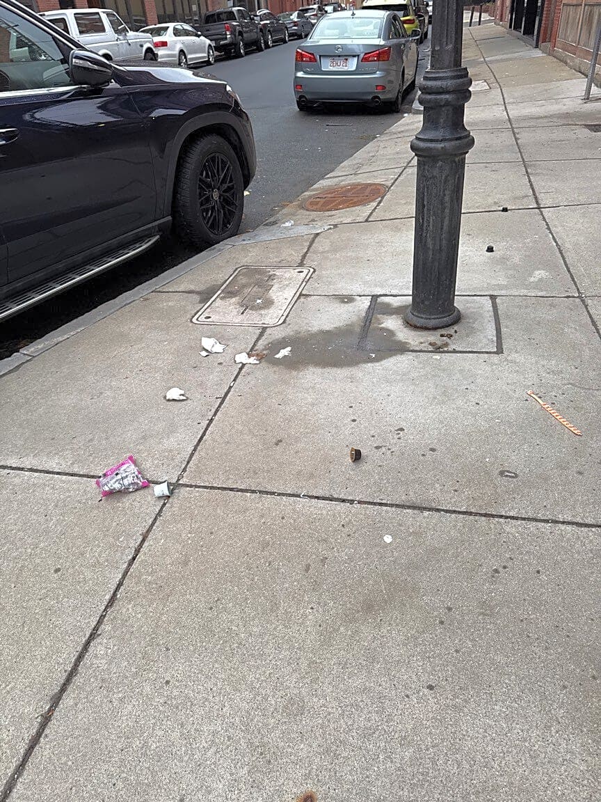 Intersection Of Anson St And Saint Mark St, Jamaica Plain, MaMany needle caps on the ground
