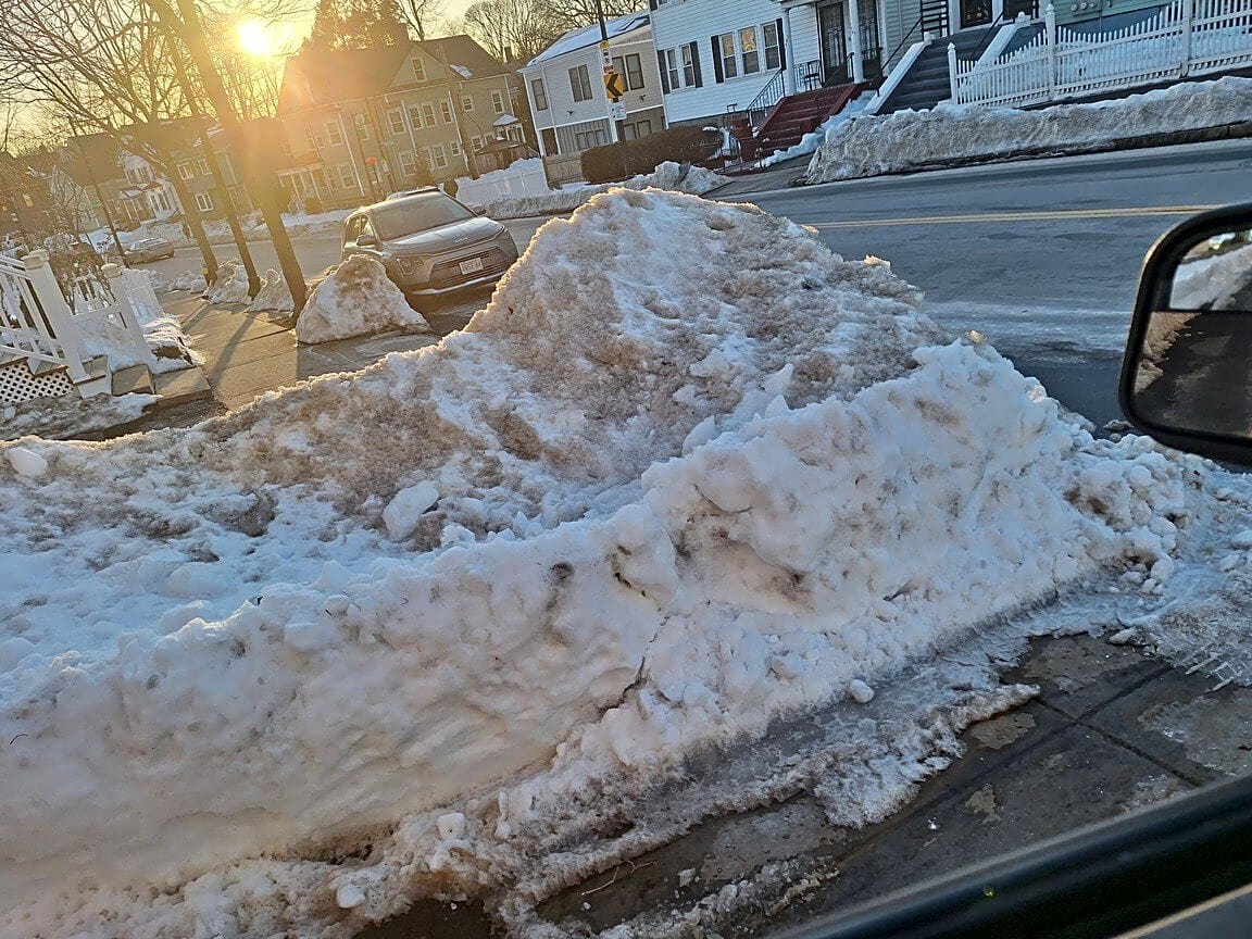 1344 River St, Hyde Park, Ma, 02136Mound of snow end of driveways on apartment building and a house who's responsible sidewalk impassable if 1342 responsible 6179291990 is landlord they don't see or get the fine on paper