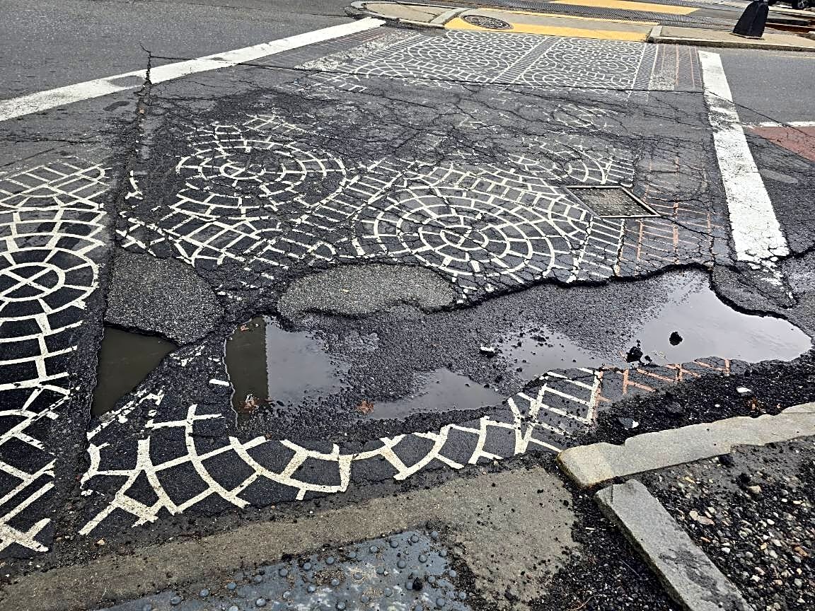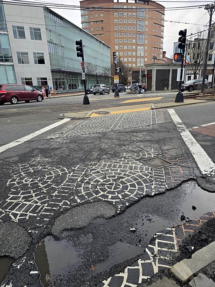 Intersection Of Forsyth Way And Parker St And Huntington Ave, Boston, MaBroken pavement in crosswalk next to curb, Huntington Ave. just southwest of Forsyth Way.