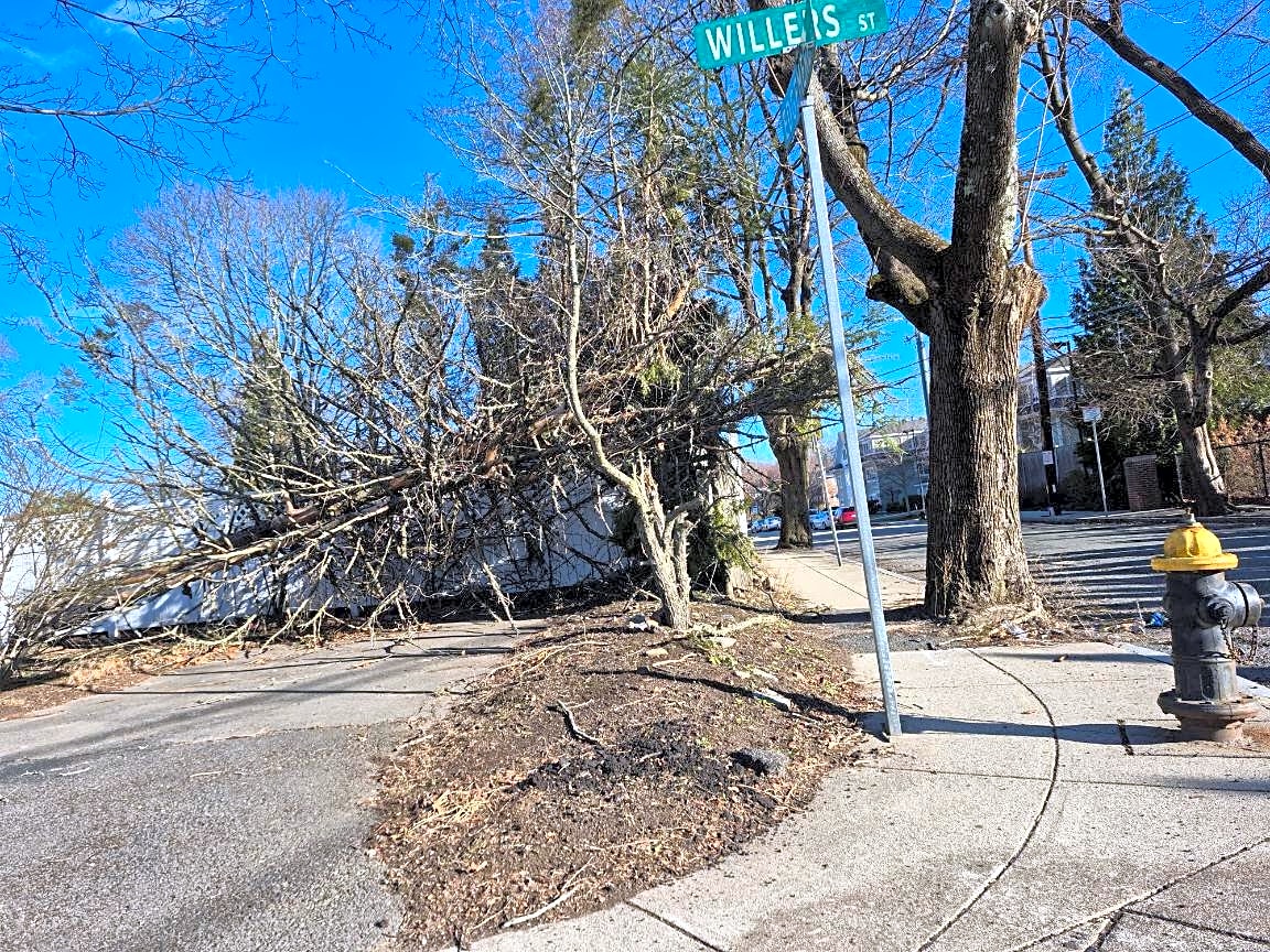 Intersection Of Edgemere Rd And Willers St, West Roxbury, MaFallen tree in yard at the corner Willers and Edgemere Road with some branches hanging above the sidewalk.