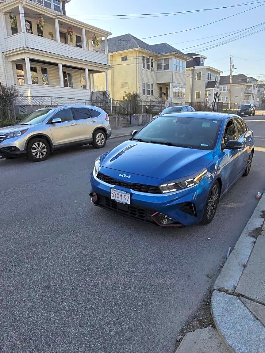 Blue Kia sedan parked at fire hydrant, license is 5yxm97. For documentation purposes.