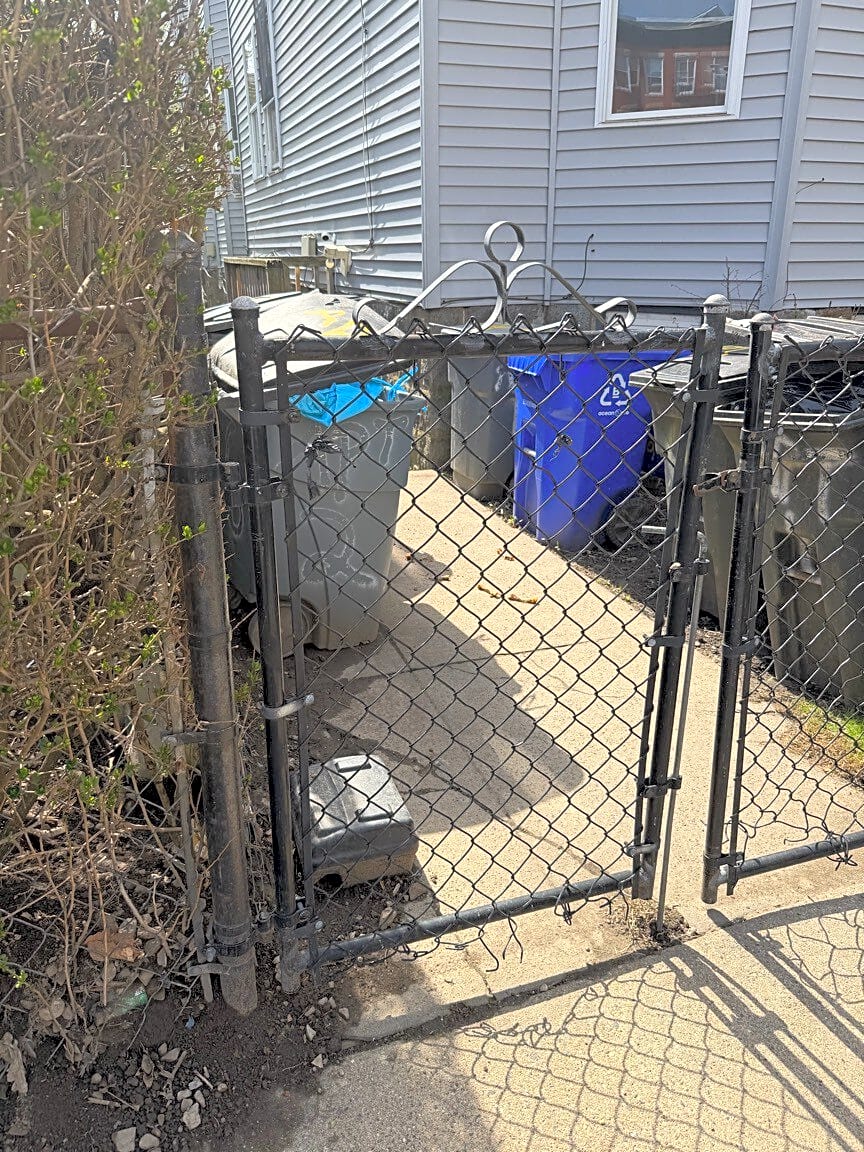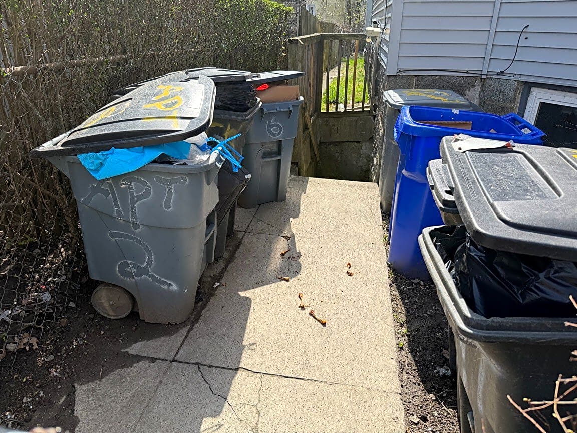 6 Calder St, Dorchester, Ma, 02124Trash and chicken bones are outside the garbage can.