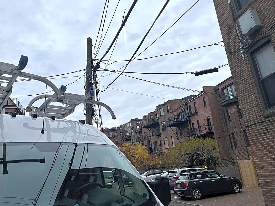 Wires dangling down low from telephone pole create a safety risk when larger vehicles park underneath them. Our parking space is in Private Alley 534. See photos.