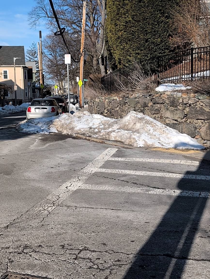 Intersection Of Newbern St And Carolina Ave, Jamaica Plain, MaSidewalk at crosswalk left unshoveled.