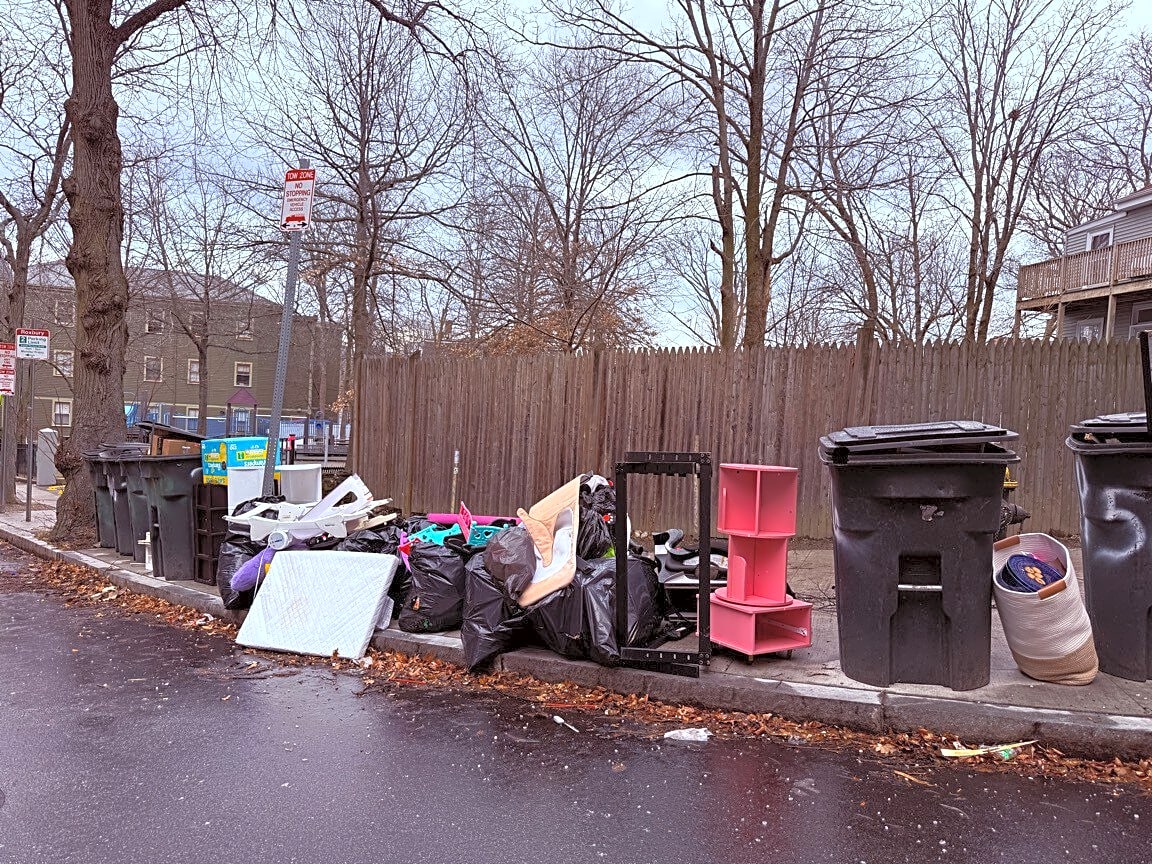 Trash from 3,5,and 6 Mt Pleasant Ter put out incorrectly. The next day for trash collection is in Four days, Monday, December 29. This is hazardous.