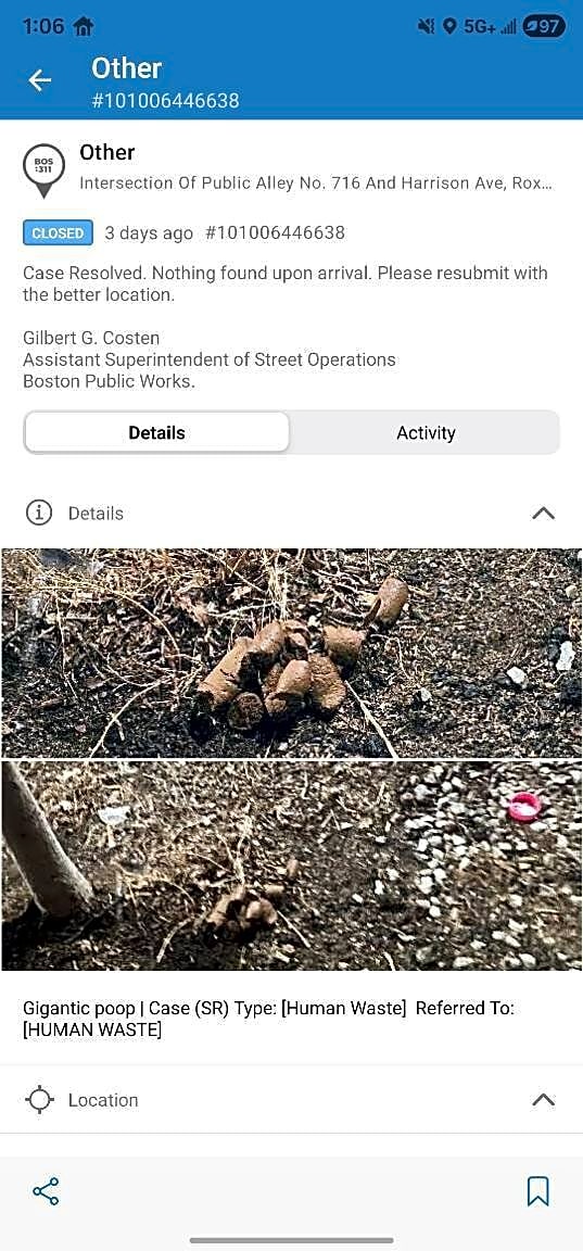 Intersection Of Public Alley No. 716 And Harrison Ave, Roxbury, MaResubmitting case for human poop on the street as requested. This human poop has been here for at least 5 days. Please see the picture with the exact location. It is a tree on Harrison avenue between East Springfield and Mass Ave. As you can see in the picture the poop is in the foreground by the tree lunch is to the left the sign of the corner of Harrison and East Springfield is in the background.