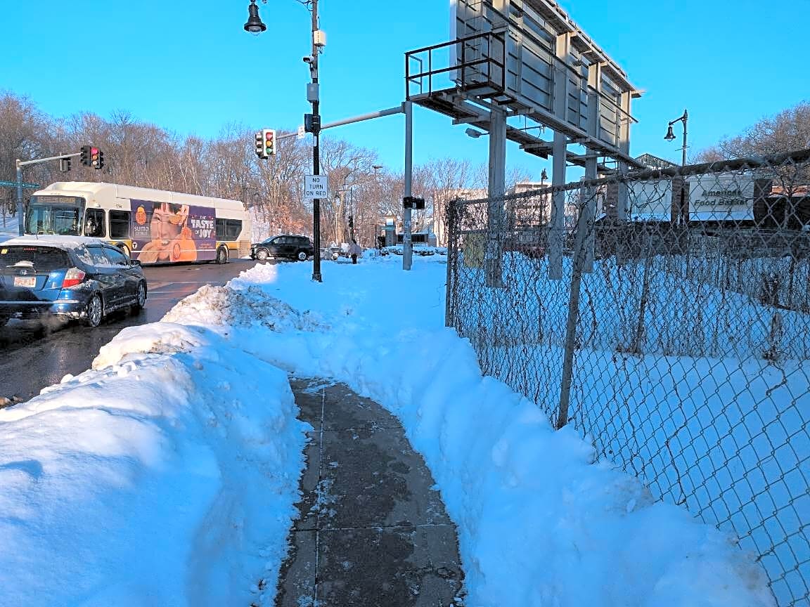 Intersection Of Columbia Rd And Pasadena Rd, Dorchester, MaSeaver street w Columbia road bus stop is full of snow. No where to stand without being on the street waiting for the bus.
