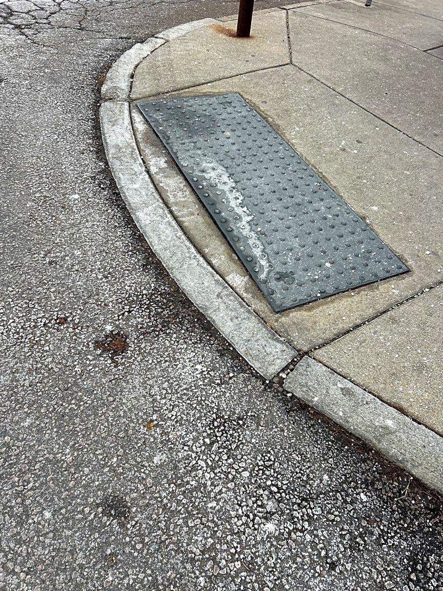There is not a rubber mat for the handicap, crossing on the corner on the sidewalk like the one across the street from it, which is about to come up as well