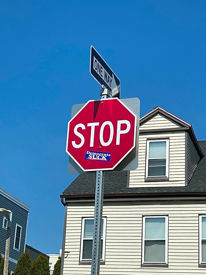 Intersection Of Athens St And C St, South Boston, MaOffensive Bumper sticker on STOP sign located at Athens St and C St intersection