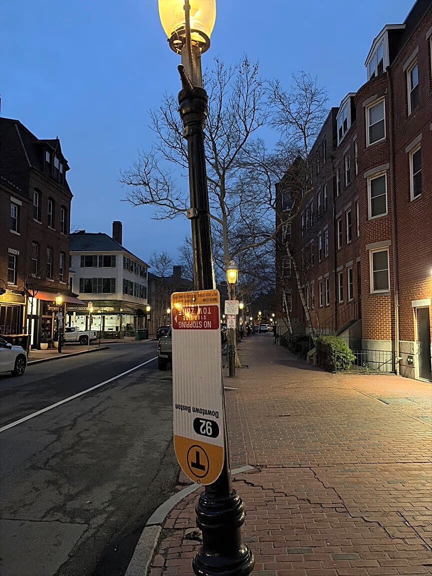 90 92 Main St, Charlestown, Ma, 02129Bus sign dangling, missing top screw. Main Street and Harvard street Charlestown, across the street from Sullivan’s Public House