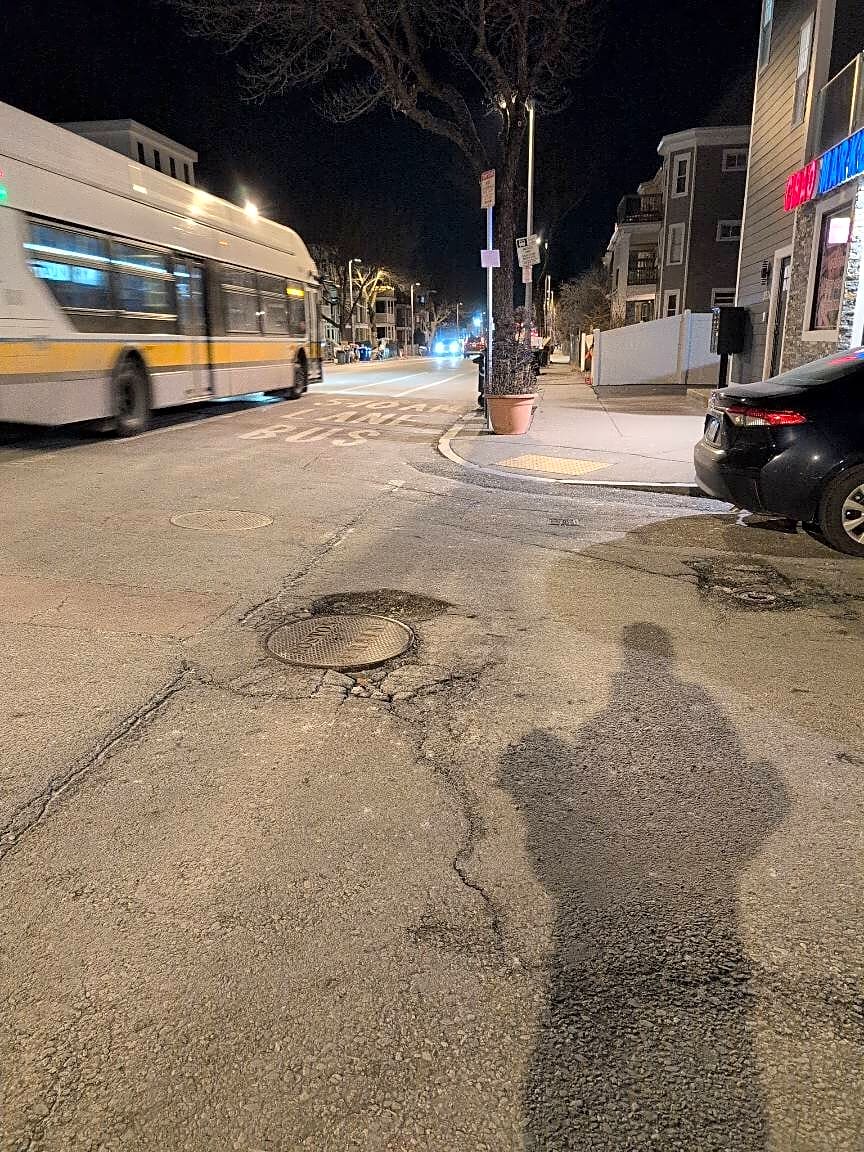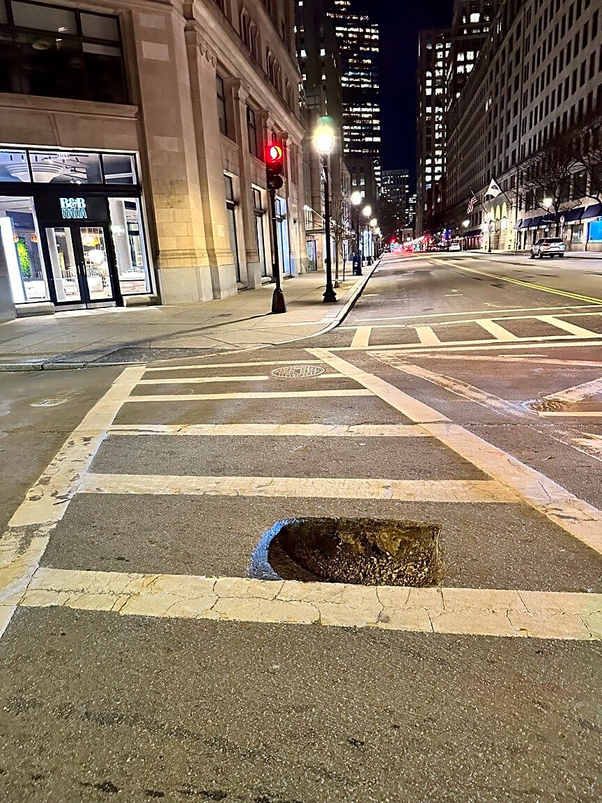 Intersection Of Park Plz And Arlington St And Saint James Ave, Boston, MaHole in middle of street. A person could hurt themselves if they didn't notice it - or car for that matter