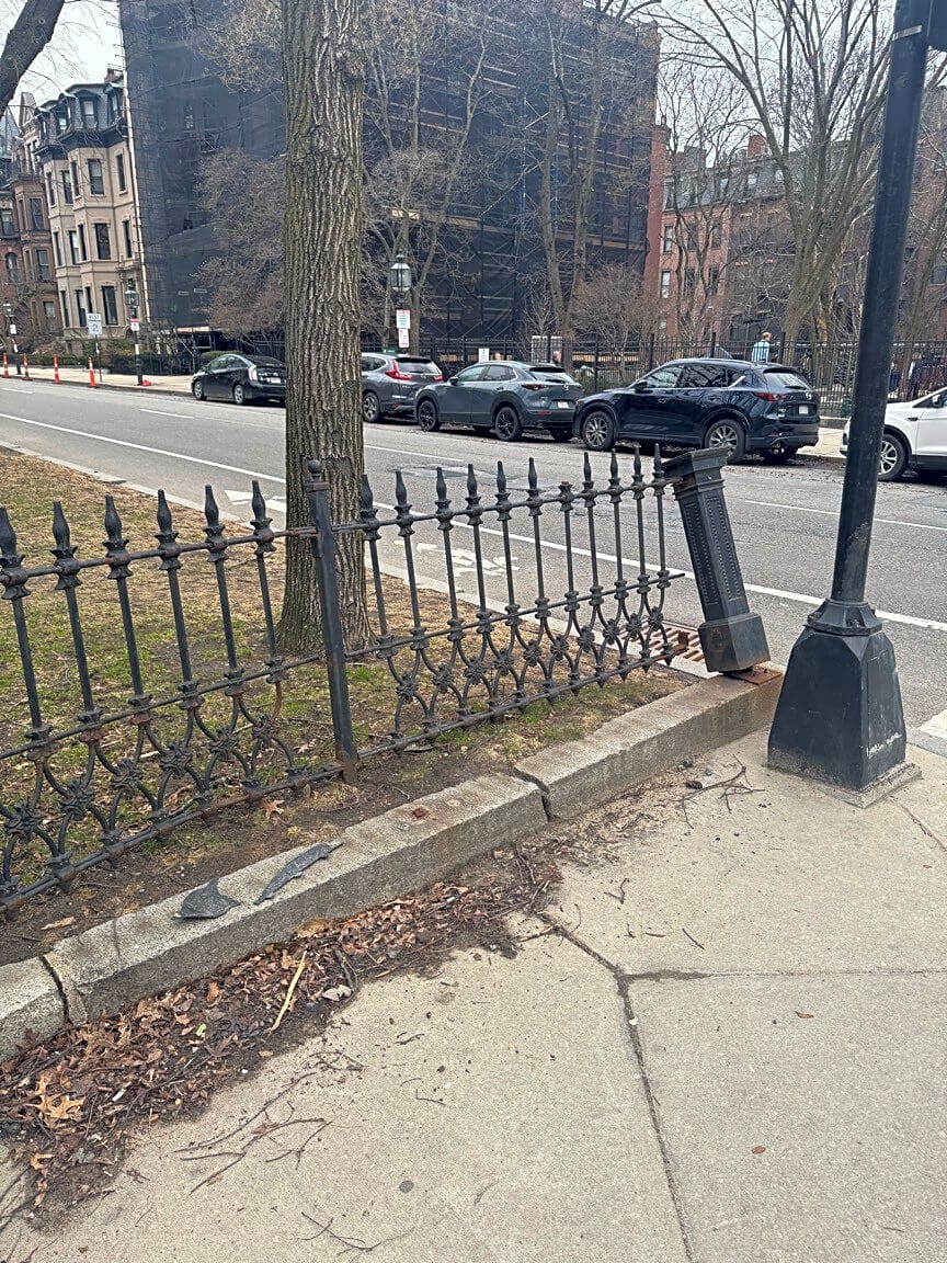 Intersection Of Clarendon St And Commonwealth Ave, Boston, MaBroken fence on Comm Ave mall at Clarendon (hit by car?)