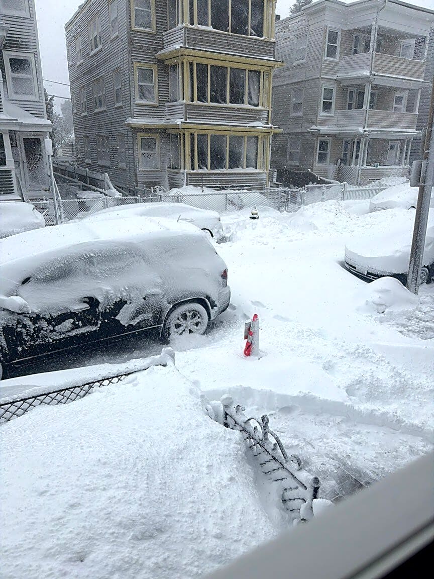 57 Saxton St, Dorchester, Ma, 02125This is the second time the same car is parked in front of our driveway during a snowstorm. Would really appreciate it if the city would come and tow it because it’s blocking our driveway and we even put a sign out as you can see in the photo.
