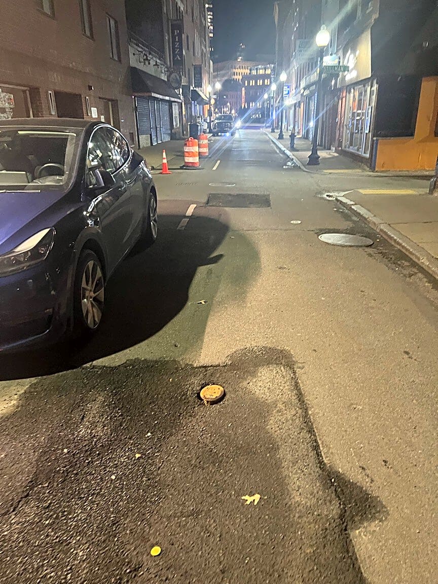 Intersection Of Wiget St And Salem St, Boston, MaCan someone please address these pot holes on Salem Street before someone gets hurt. There was work being done recently and it looks like they were poorly covered. Also, there is a pothole forming directly on the sewer. Photos are between Paulies and Terramia. Not hard to miss