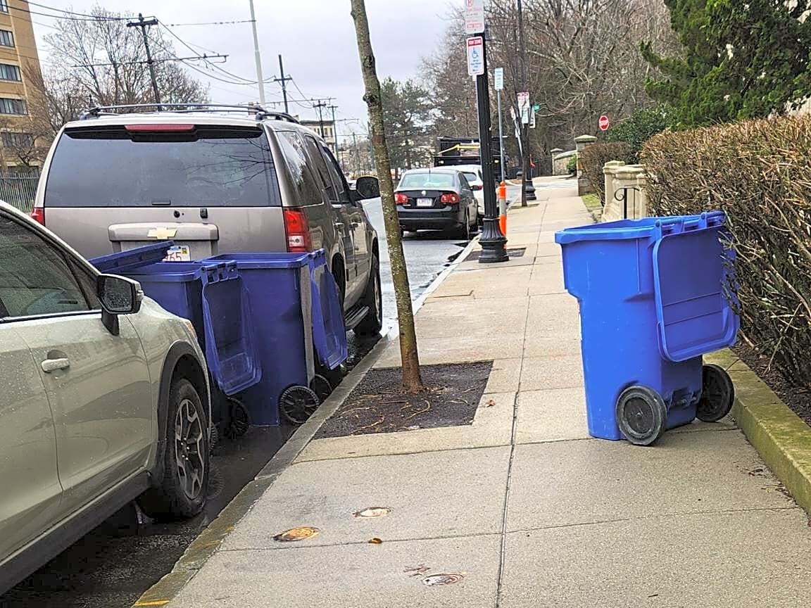 1950 Commonwealth Ave, Brighton, Ma, 02135Recycling barrels left on street/sidewalk