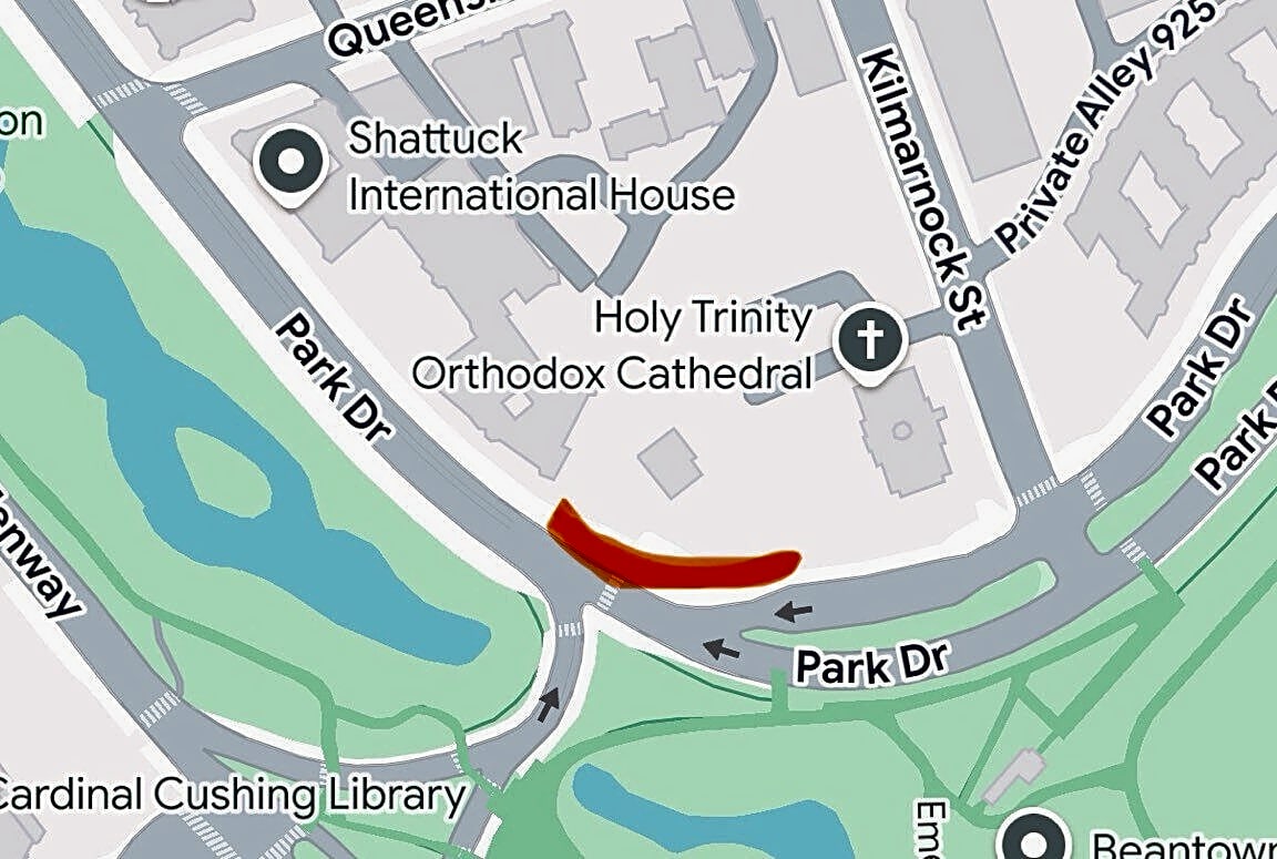 Intersection Of Higginson Cir And Park Dr, Boston, MaSidewalk not cleared of snow, especially from sidewalk to crosswalk adjacent to (but not in front of) 191 park drive (orange highlight in photo)