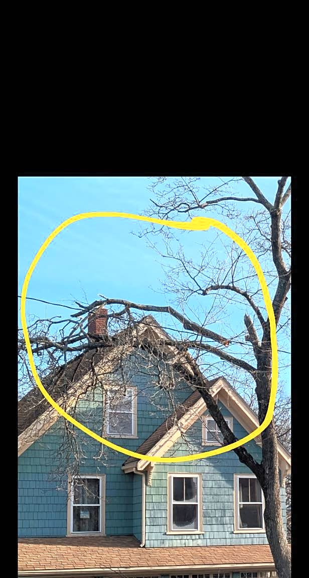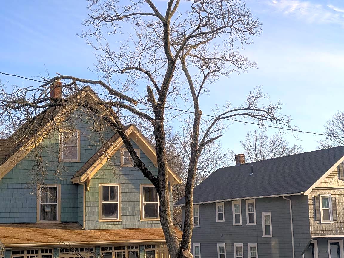 Broken tree limb threatening to fall down on people and cars. Right in front of 25 Cotton Street, Roslindale.