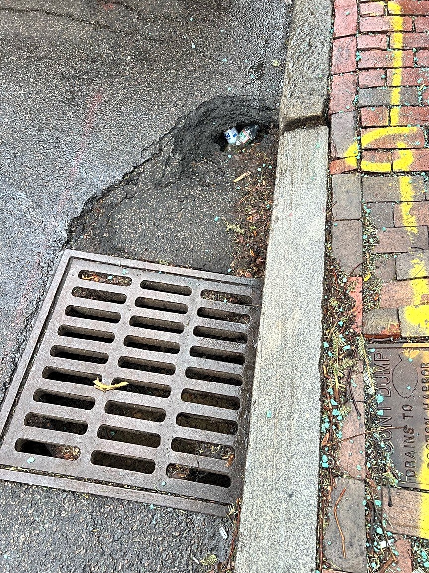 Seems like the start of a sink hole or large dip near a sewer drain. On the corner of Milford and Taylor street in the South End (near Coppa restaurant).