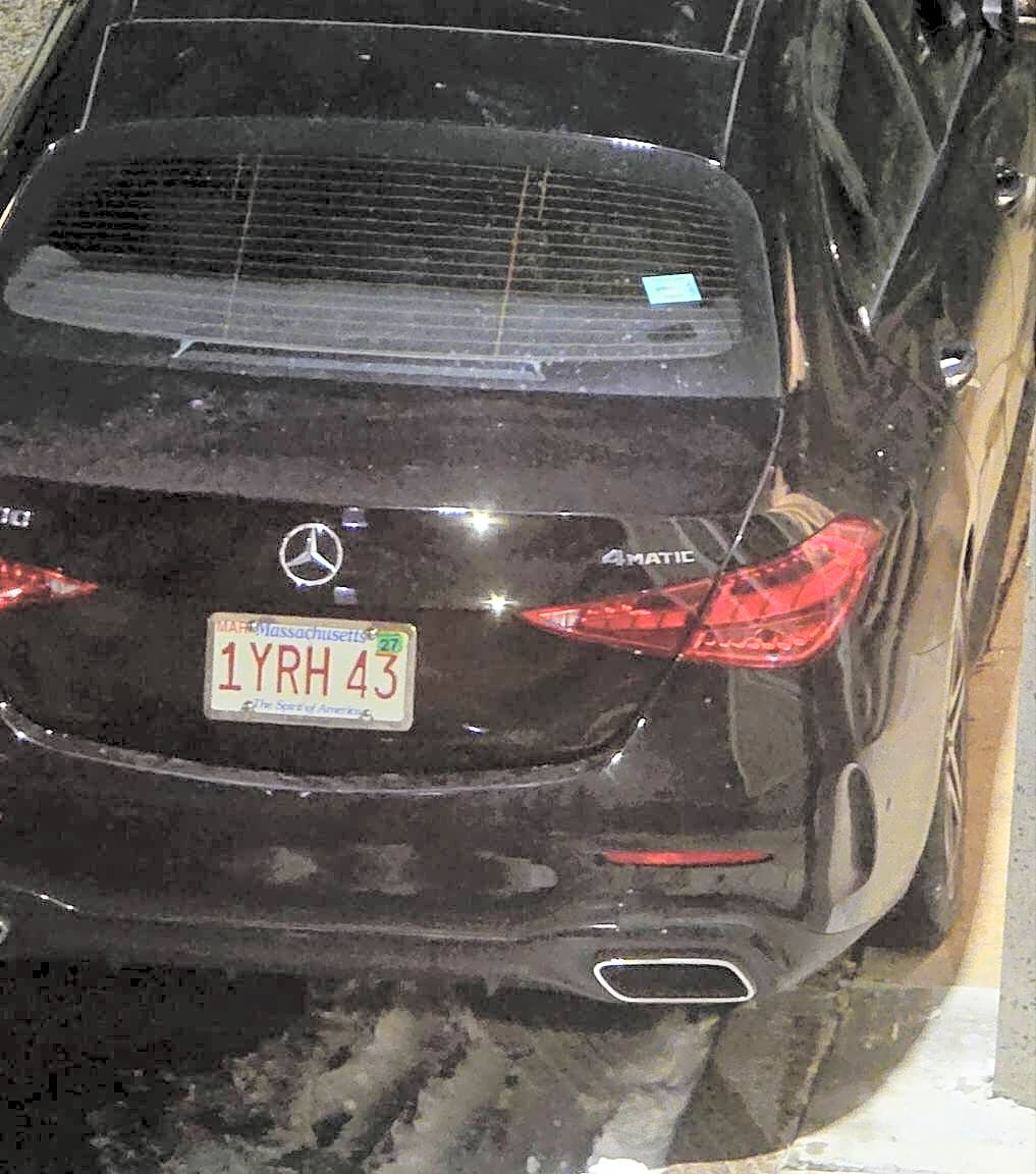 Parked illegally and some what on the side walk. At the corner of 1 Russel St. If there was an emergency a fire truck wouldn't be able to make the turn from Pearl onto Russel St. Black Mercedes plate# 1YRH43.