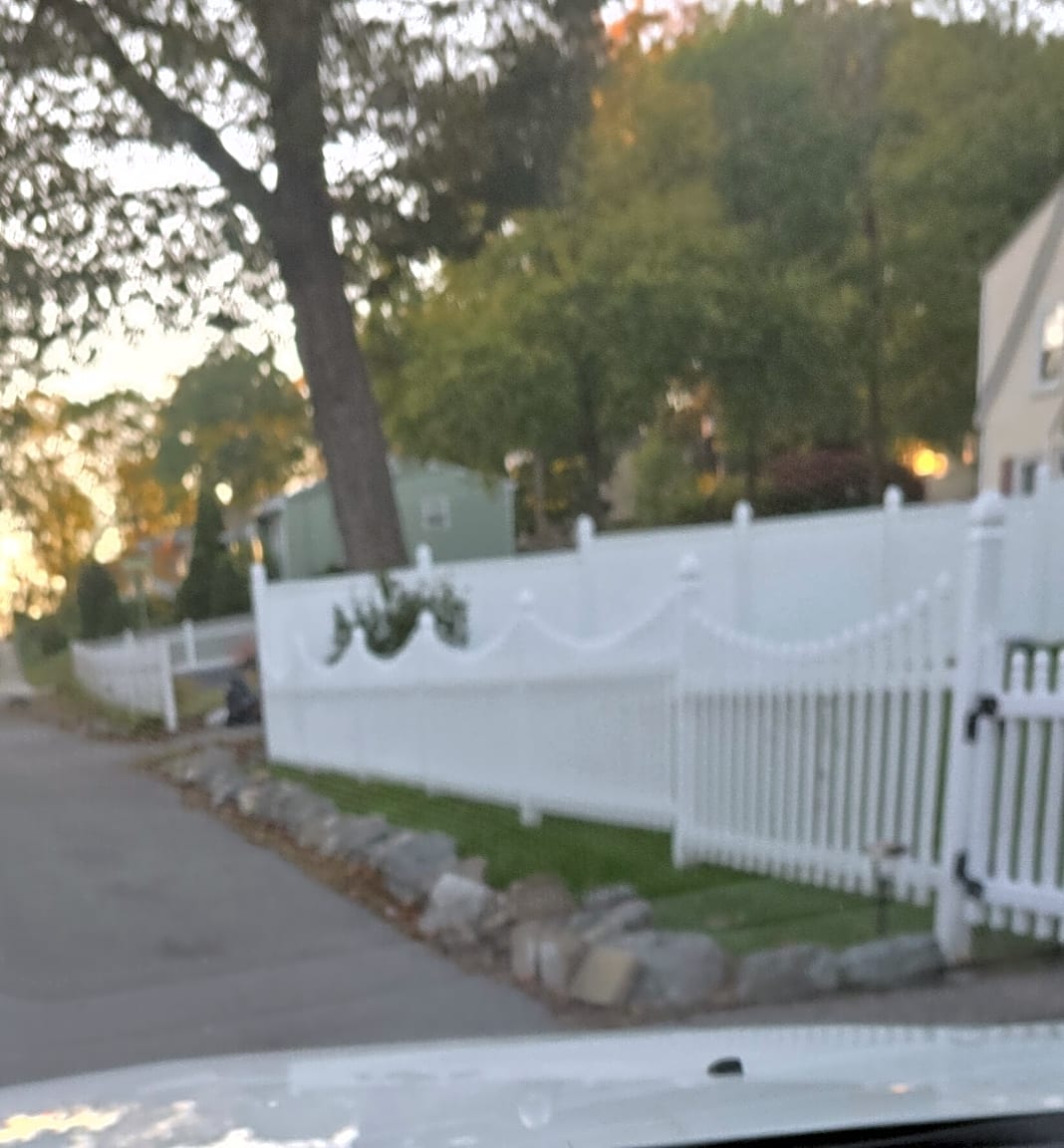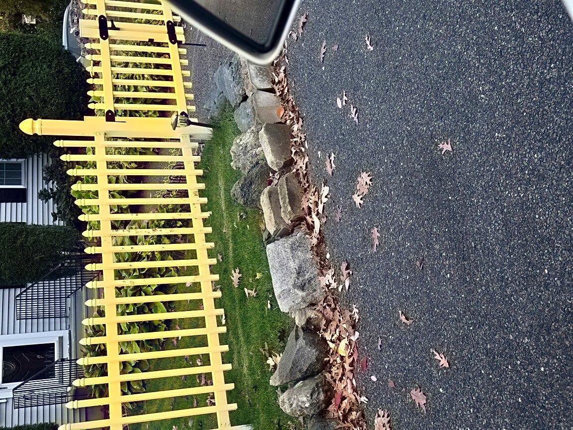 Overgrown grass and shrubs from private property to sidewalk.
