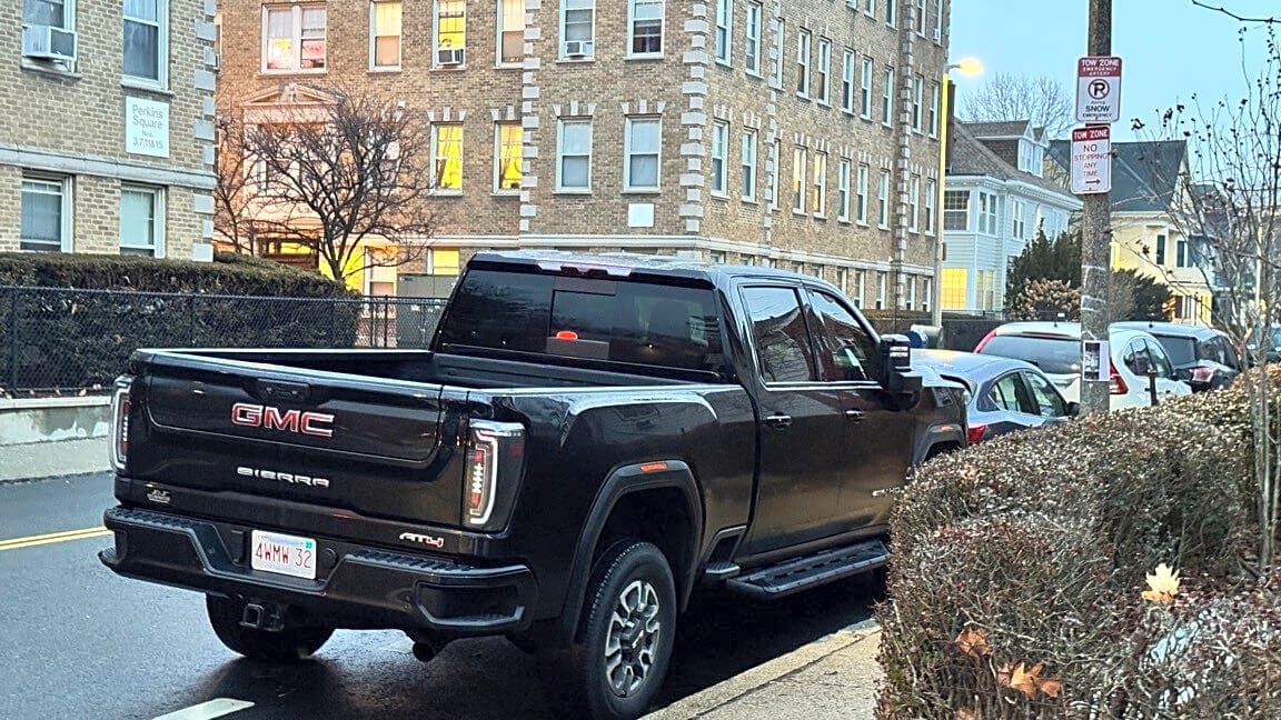 Intersection Of Pond View Ave And Perkins St, Jamaica Plain, MaThis truck is parked in a tow zone which presents a safety risk on a tight road.