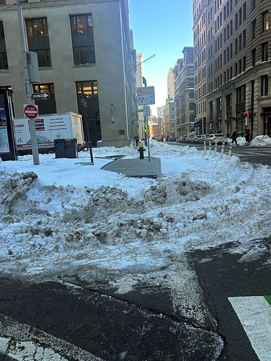 Intersection Of Oliver St And Kilby St And Milk St, Boston, MaWalk cleared in middle but no way to get to the shoveled part as it’s surrounded by snow banks