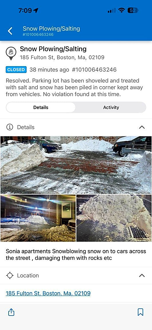 That is not the complaint. The complaint is they cleared the parking lots with a snowblower and blew snow and rocks all the way across the street onto resident cars on the even side of Fulton.