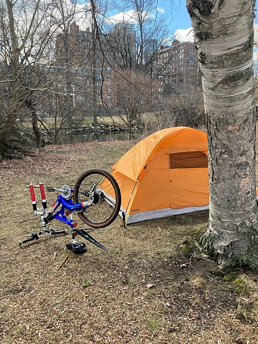 21 James J Storrow Memorial Dr, Boston, Ma, 02116Camper with nice bike & tent lives in Otis Grove on the Esplanade. Esplanade Association advised contacting 311. I suggest removing the bum.