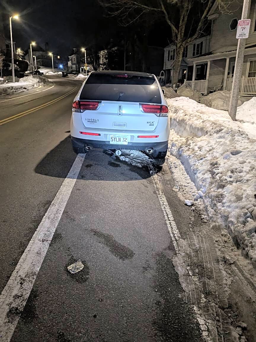 121 Cummins Hwy, Roslindale, Ma, 02131Vehicle parked partially in the bike lane instead of shoveling out the parking space.