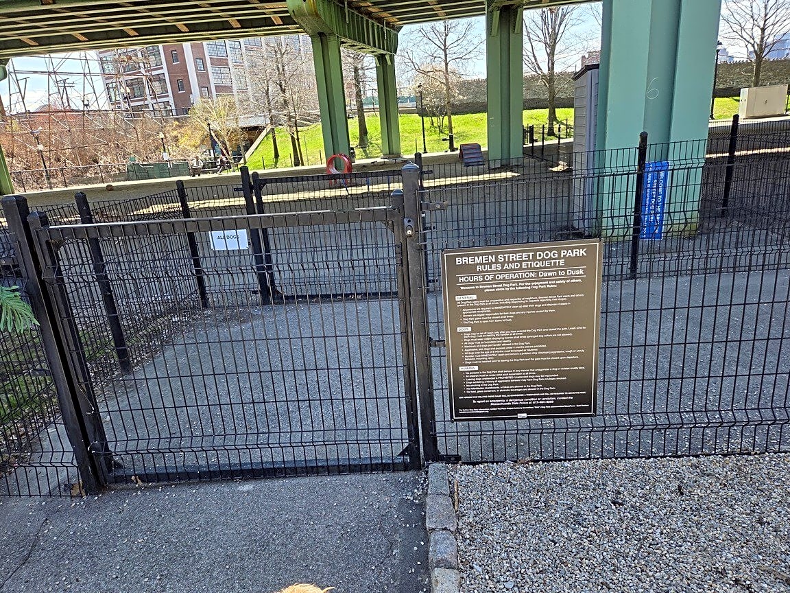Bremen St & Porter StThe gate at the dog park on Bremen Street is broken and cannot be securely locked, which could allow dogs to run out of the park. Please check it and have it fixed as soon as possible. Thank you.