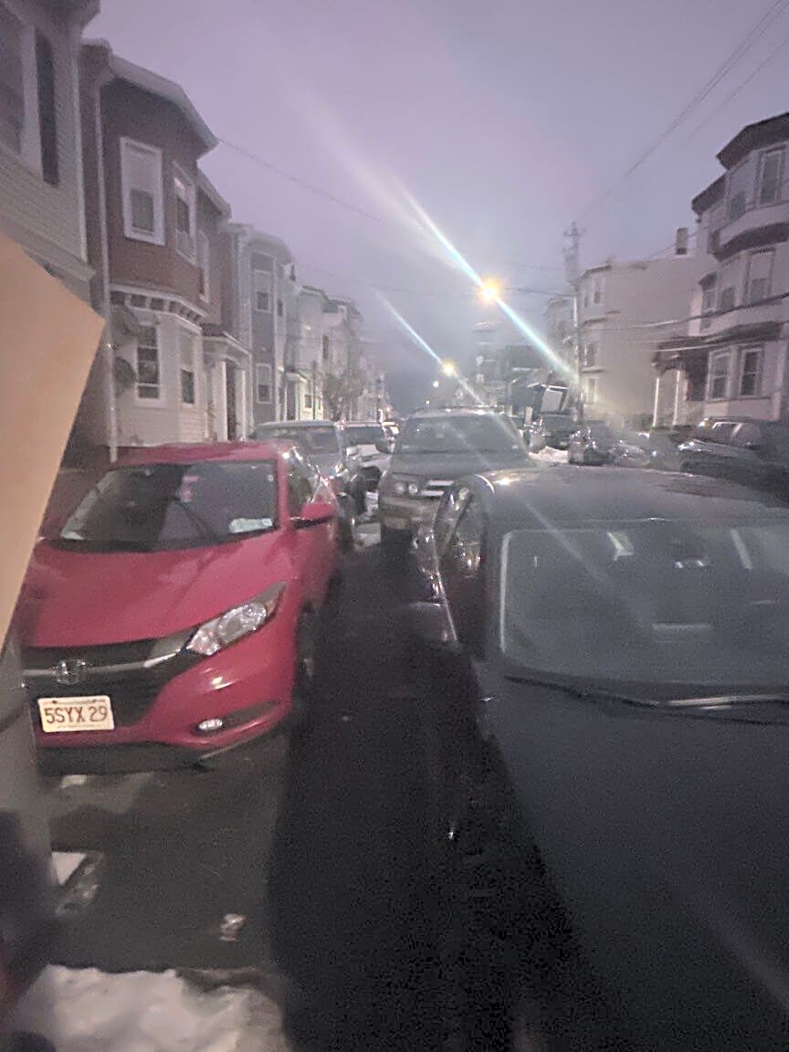 30 Falcon St, East Boston, Ma, 02128Double parked cars on street snow emergency no lights out of state