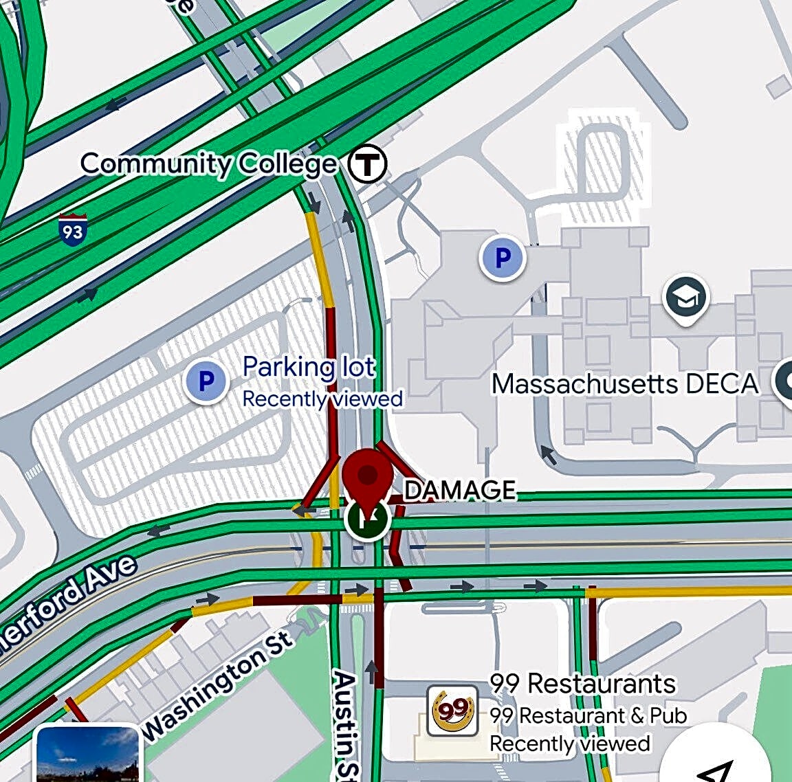 Intersection Of Austin St And New Rutherford Ave, Charlestown, MaThere is a dangerous pothhole at this intersection. Cars are swerving to avoid it, and this morning it popped my tire, which now needs to be fully replaced. It is a deep hole and sharp edge of metal from the bridge. There are several prior 311 reports, including one submitted earlier today that was marked closed, but the pothole is still there and worsening. Failure to address is a severe safety concern.