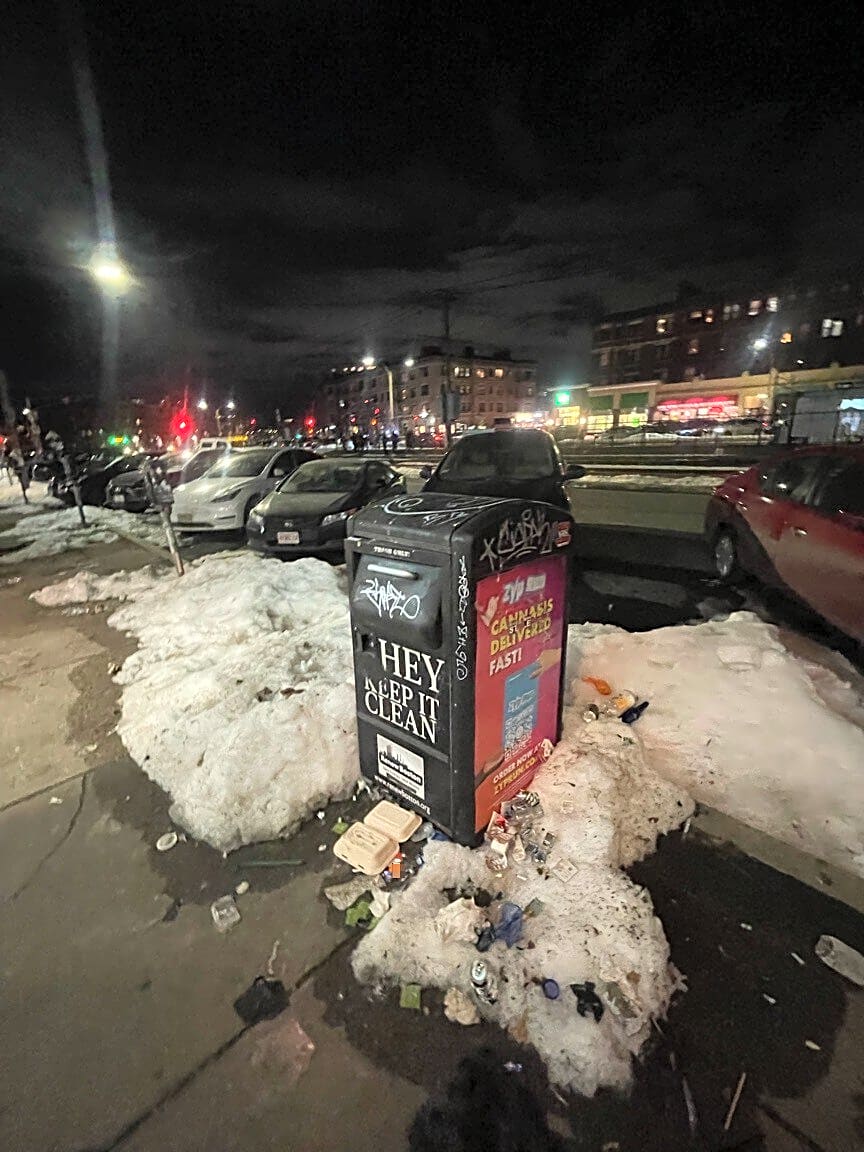 1245 Commonwealth Ave, Allston, Ma, 02134Overflowed trashcan, trash all over sidewalk and street especially starting at 7/11 and ending by pavement