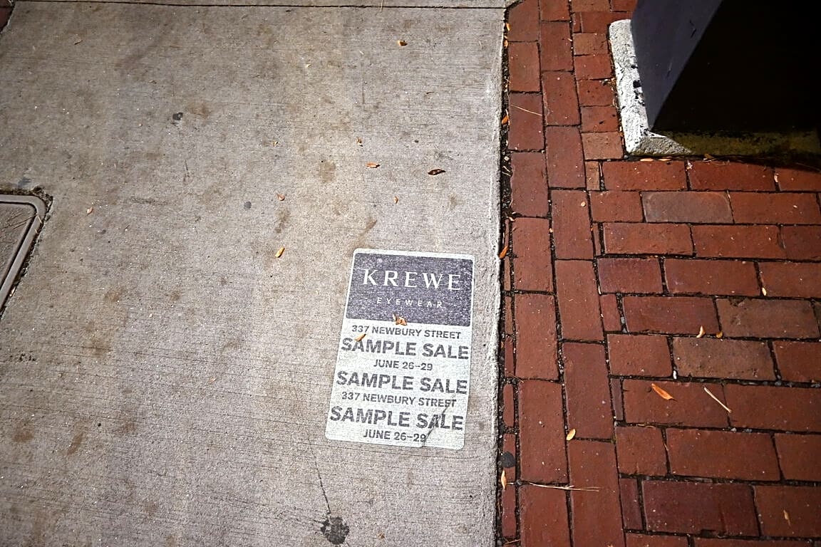There is an advertisement stuck to the public sidewalk on the northwest corner of the Newbury St and Dartmouth St intersection.