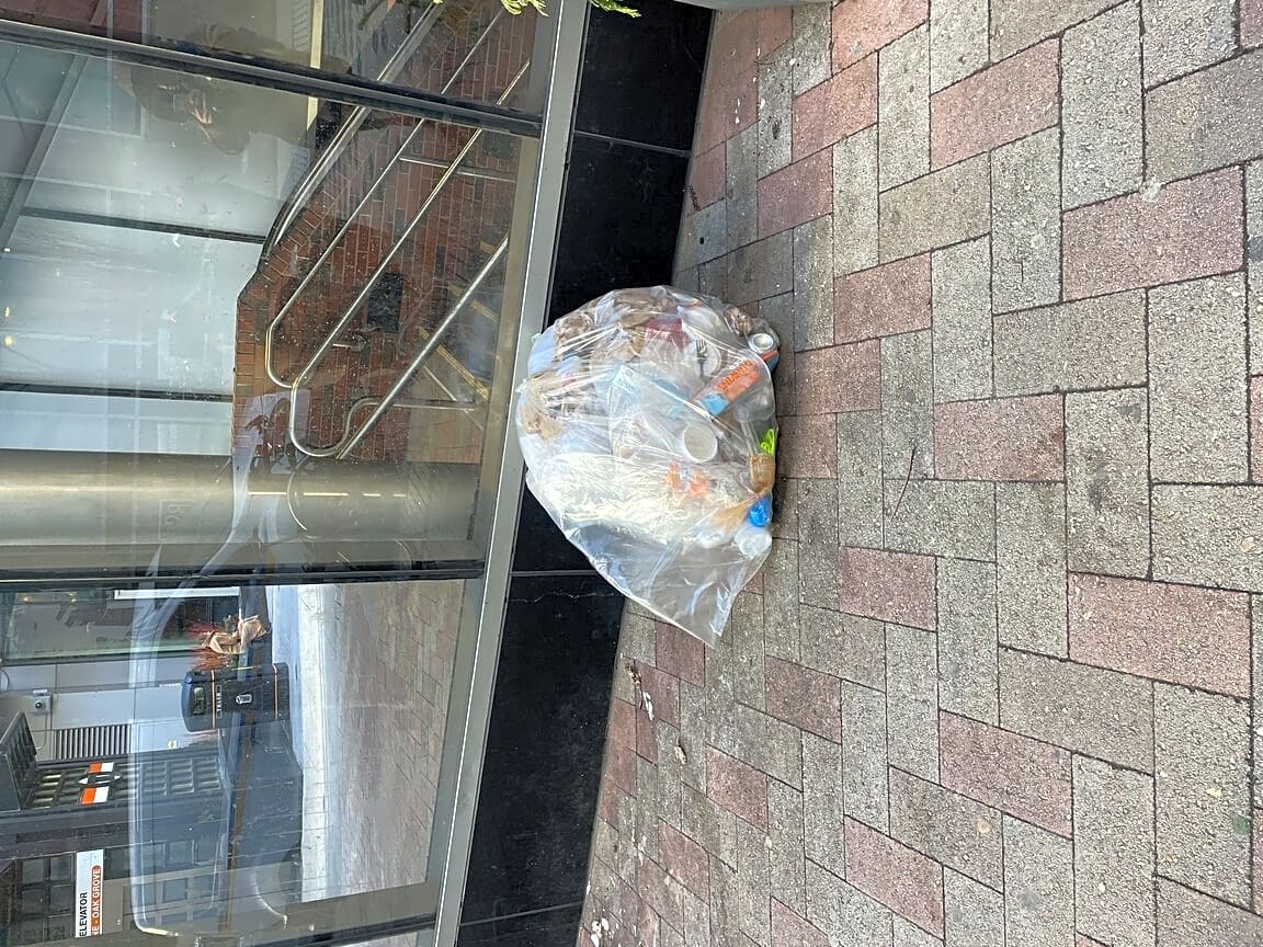 363 Washington St, Boston, Ma, 02108Large plastic bag of rubbish on street by orange line entrance. Under the staircase and across from the marshalls