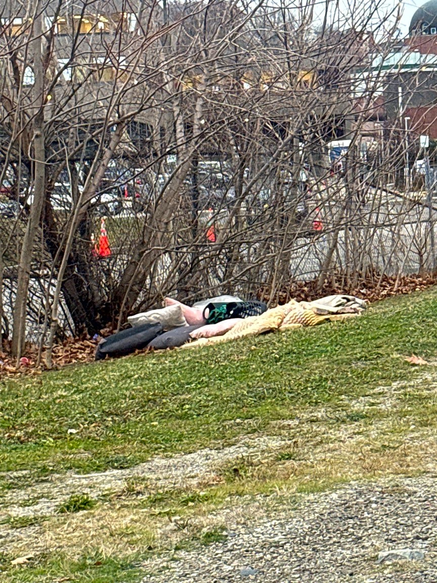 1199 Tremont St, Roxbury, Ma, 02118Pile of discarded blanket and trash, in the grass across from 1 Schroeder plaza
