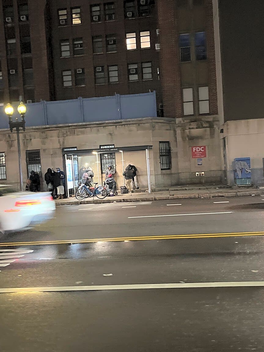 Intersection Of Massachusetts Ave And Albany St, Roxbury, Ma6-8 folks congregated. Drug usage beside the bus shelter.