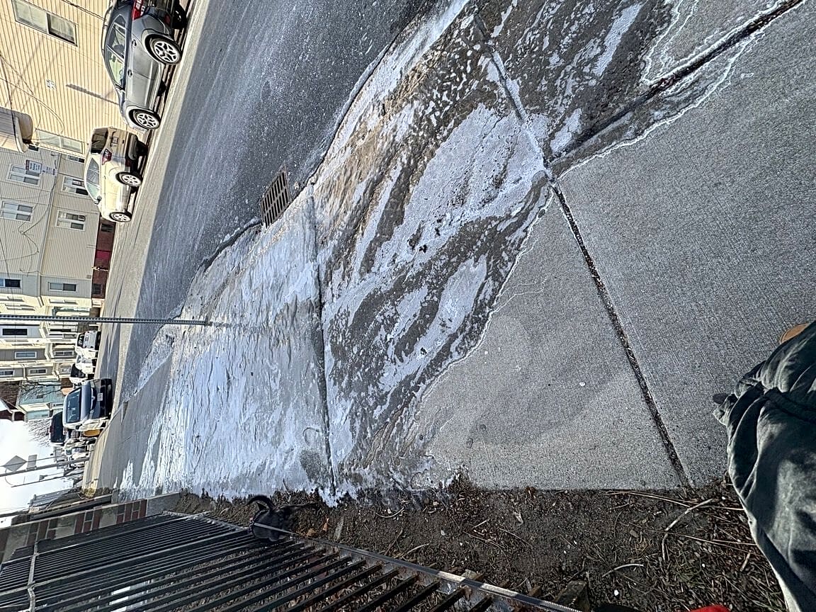 86 W Eagle St, East Boston, Ma, 02128This sidewalk consistently gets frozen and it is extremely dangerous. It freezes almost the entire sidewalk down the hill. Possibly because of new tubing in high school driveway.
